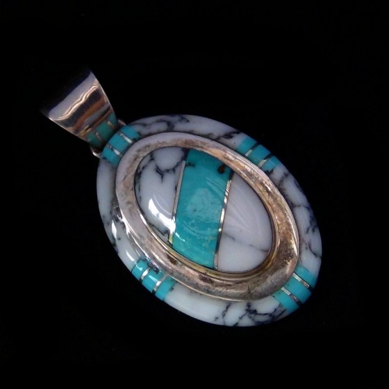 Pendentif en Argent Sterling serti de turquoise et de white buffalo stone.