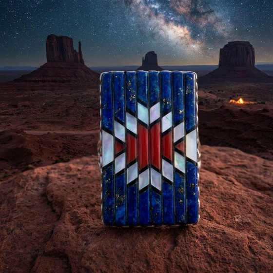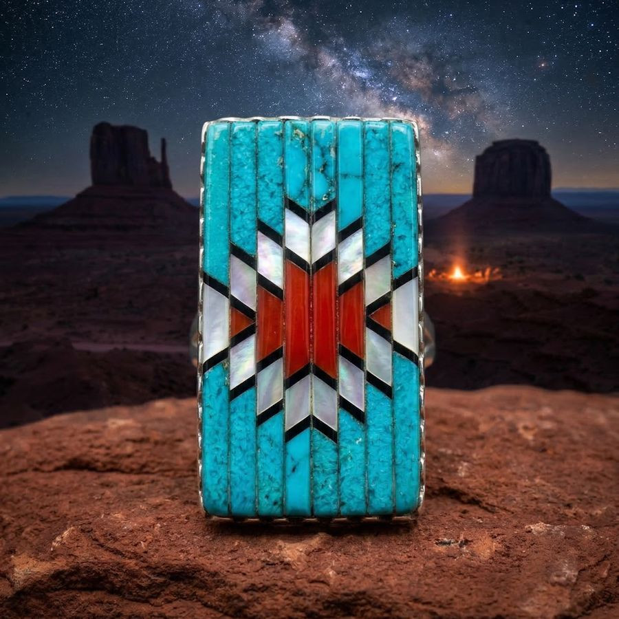 Bague navajo en Argent Sterling sertie de pierres semi précieuses taillées et disposées en Overlay.
