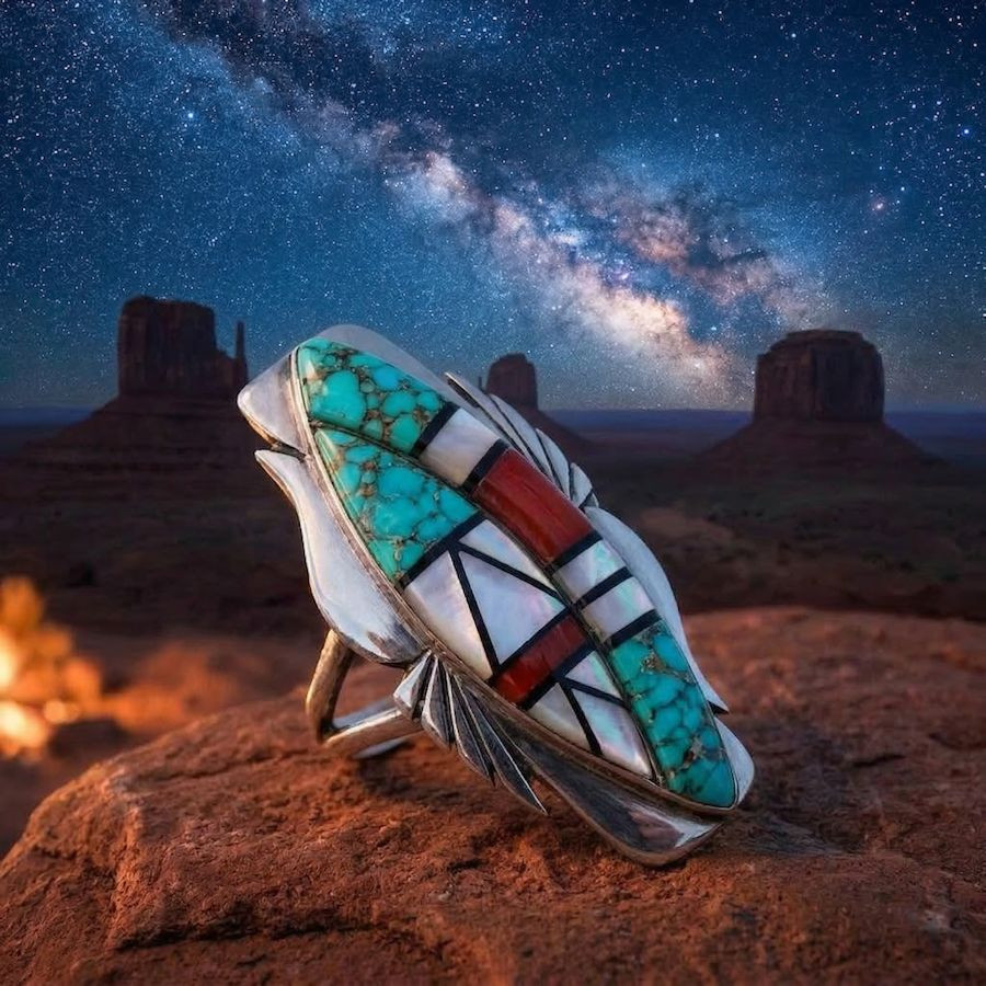 Bague en Argent 925 Pour Femme sertie de turquoise, nacre,jeais noir et corail,
