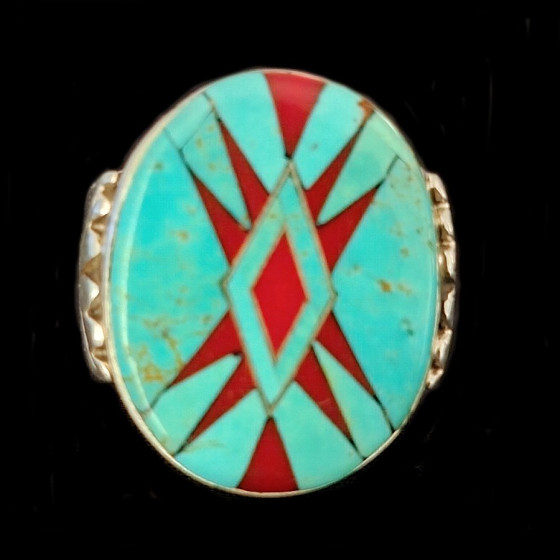 Bague en Argent Sterling sertie de turquoise et ornée d'un symbole navajo en corail.