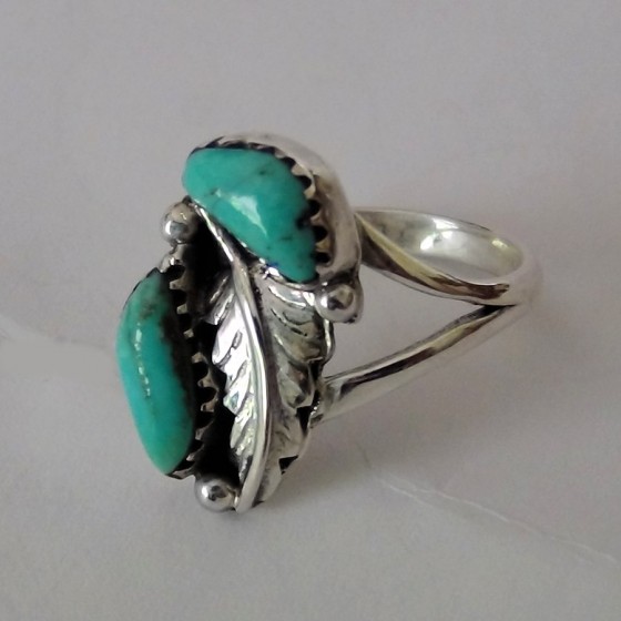 Bague en Argent Sterling/925 ornée d'une plume finement ciselée et de deux turquoises.
