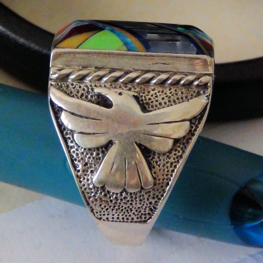 Bague en Argent Sterling/925, sertie de pierres semi-précieuses multicolores qui forment un motif navajo avec un oiseau-tonerre en relief de chaque coté.