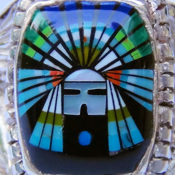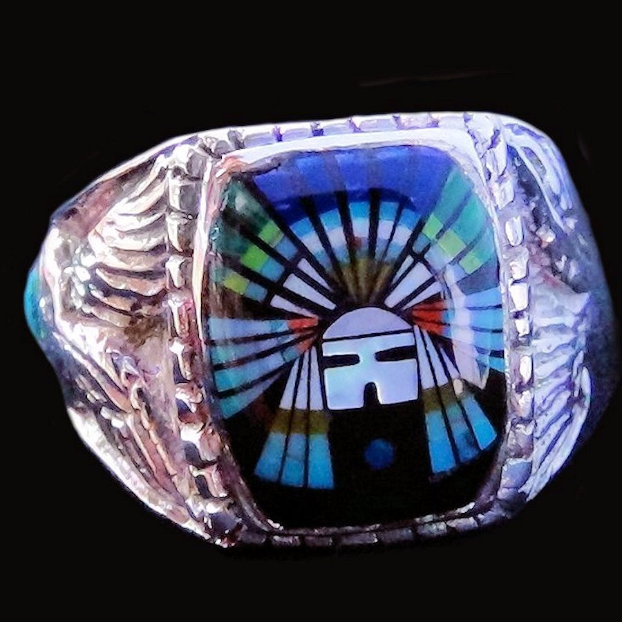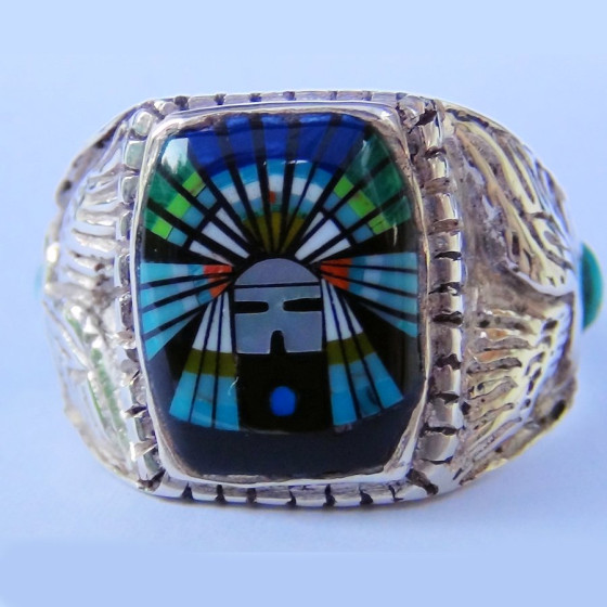 Bague en Argent Sterling/925 représentant un kashina avec des pierres semi précieuses en mosaïque finement taillées a la main – Micro Inlay. Sur chaque coté, un aigle en relief avec une petite turquoise.