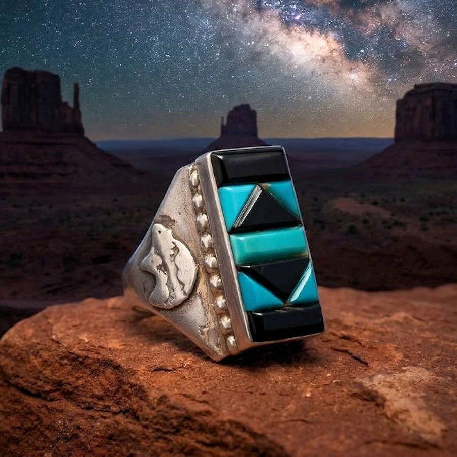 Bague en Argent Sterling 925 Sertie de turquoise et d'onyx avec un ours sacré en relief de chaqque coté.