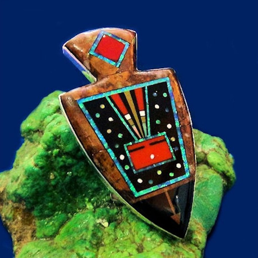 Bolo pointe de flèche en Argent Sterling/925 réalisé avec de la turquoise brune, du corail et de l'opale qui lui donne ces reflets étincelants - Dimensions 5.5 x 3 cm - Livré avec un Cordon en cuir tressé noir et embouts en argent.
