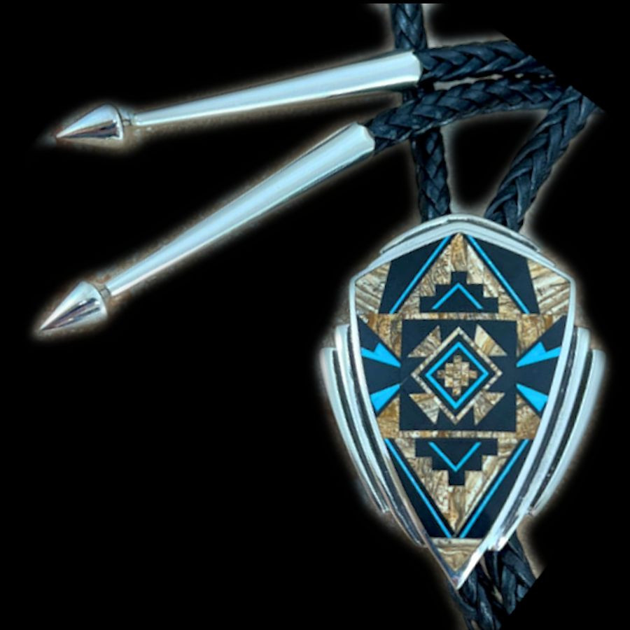 Bolo tie en Argent Sterling/925 orné d'un symbole Navajo, mosaïque de turquoise et de jeais.