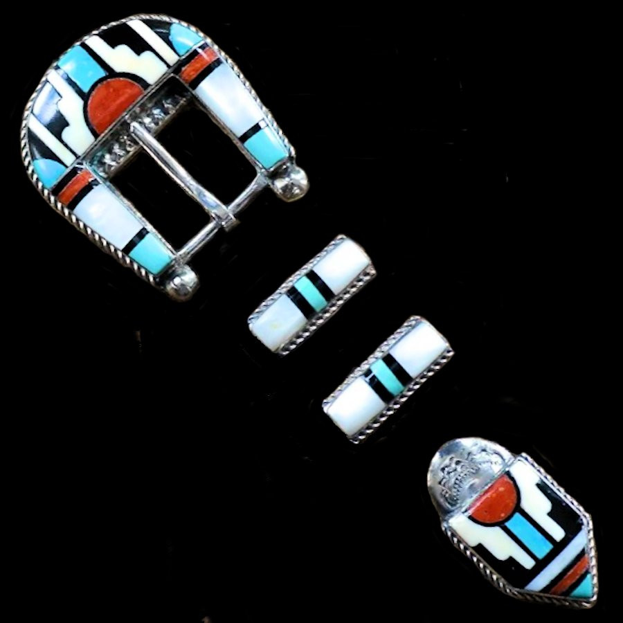 Cette boucle de ceinture artisanale Navajo en Argent sterling 925 utilise la technique de la marqueterie – inlay - pour intégrer de la turquoise, de la nacre et du corail. Ce modèle, souvent orné de symboles traditionnels amérindiens, est une pièce de collection prisée pour sa durabilité et son design western intemporel.
