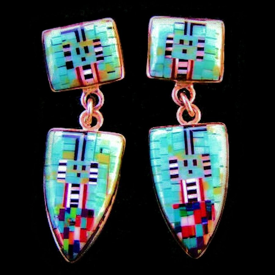 Boucles en Argent Sterling/925, ciselées en forme de pointe de flèche avec une mosaïque représentant une kashina.