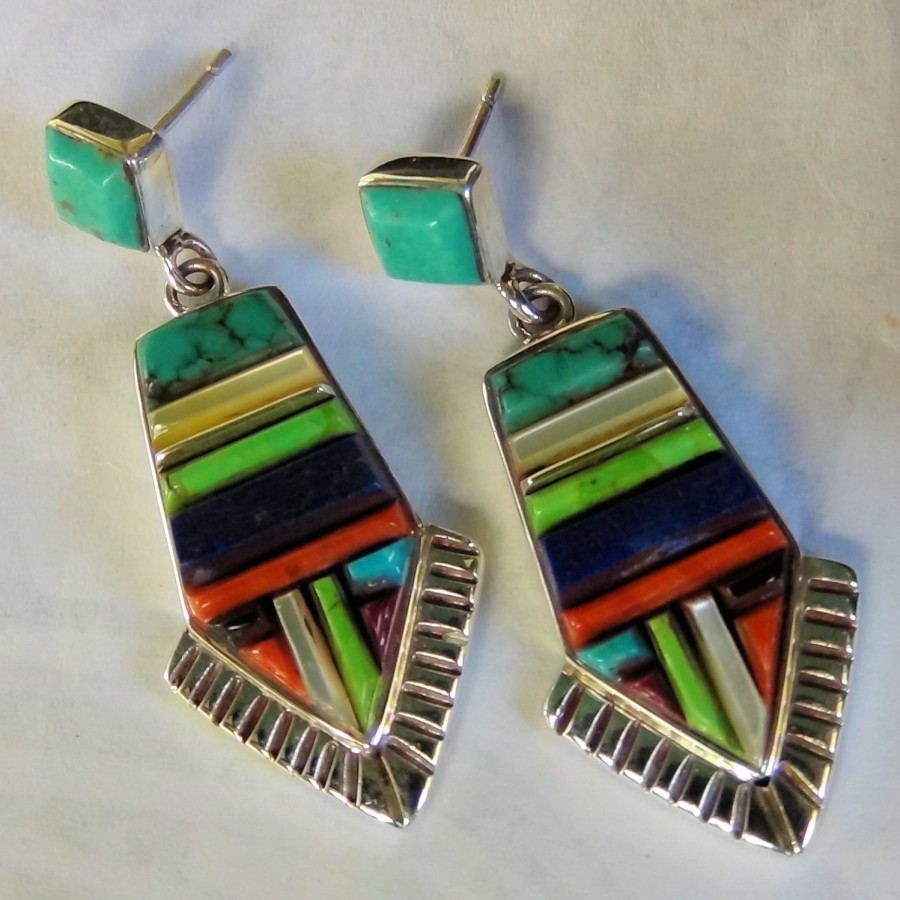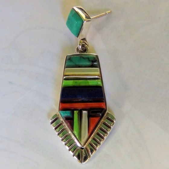 Boucles d'oreilles en Argent Sterling/925, avec des pierres semi précieuses taillées et assemblées en Cobblestone inlay. Cette technique consiste à assembler les pierres et à leur donner du relief comme les grains sur un pain de maïs. Attache clou.