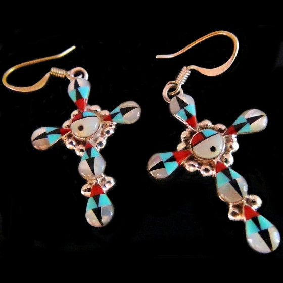 Boucles d'oreilles en Argent Sterling/925 vec une mosaïque de pierres représentant le dieu soleil zuni.