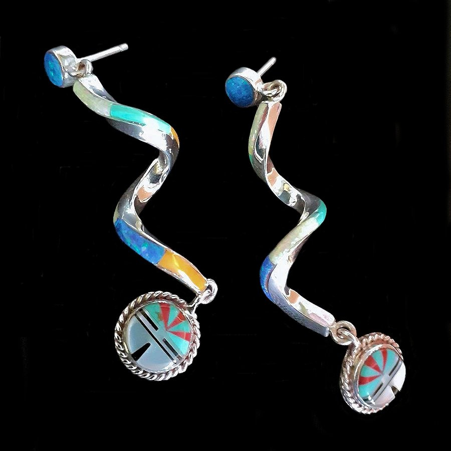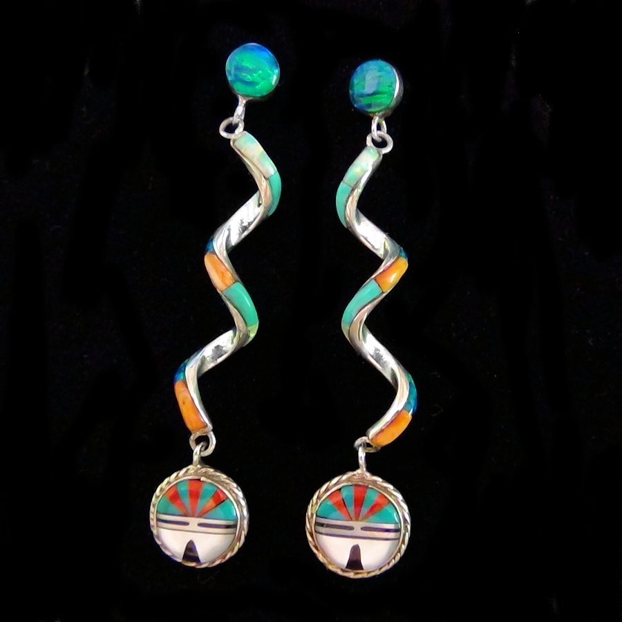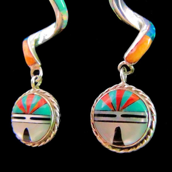 Boucles d'oreilles en Argent Sterling/925 de forme torsadées et serties de pierres multicolores, représentant le Dieu Soleil Zuni.