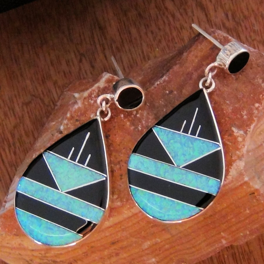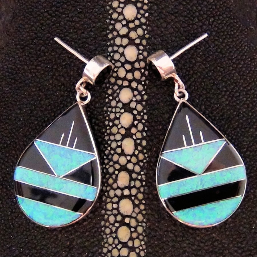 Boucles d'oreilles en Argent Sterling/925 en forme de goutte, serties de jeais noir et de lab opal.