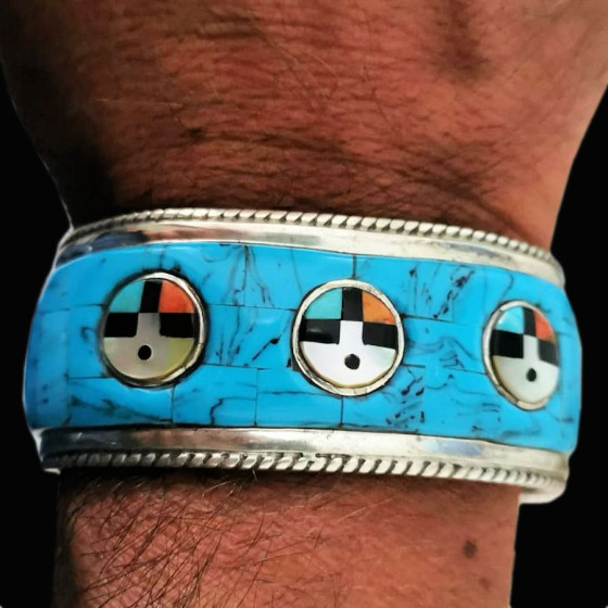 Bracelet Argent Sterling/925 orné de trois visages du dieu soleil zuni sur fond de turquoise.