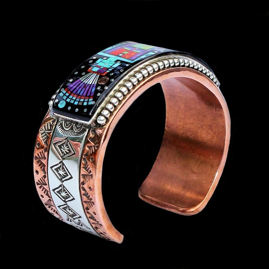 Bracelet en Cuivre et Argent Sterling/925 ciselé main et orné d'une kashina. Inlay de pieres semi précieuses.