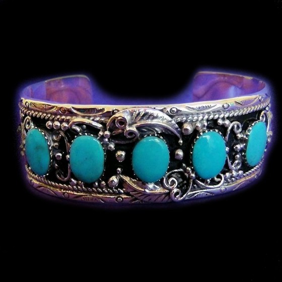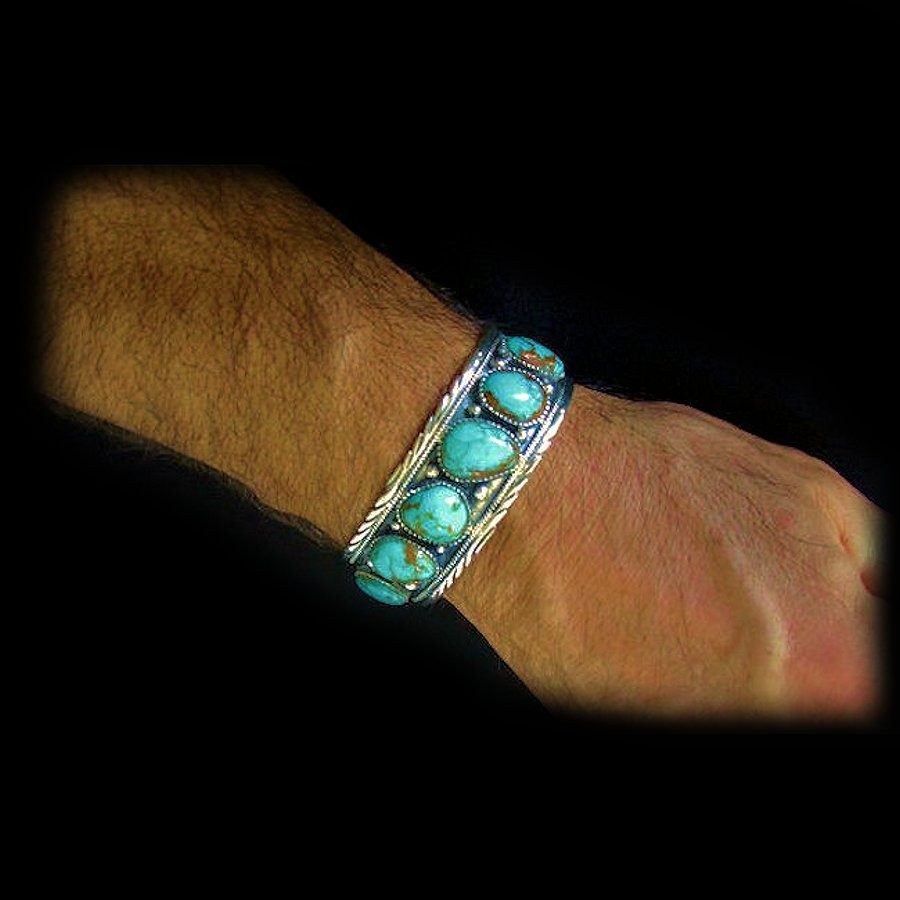 Bracelet en Argent Sterling/925, finement ciselé à la main et serti de 5 pierres dont vous choisissez la couleur lors de la commande - Largeur : 3 cm - Poids 35 - 50 g.