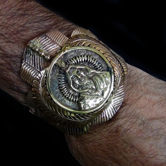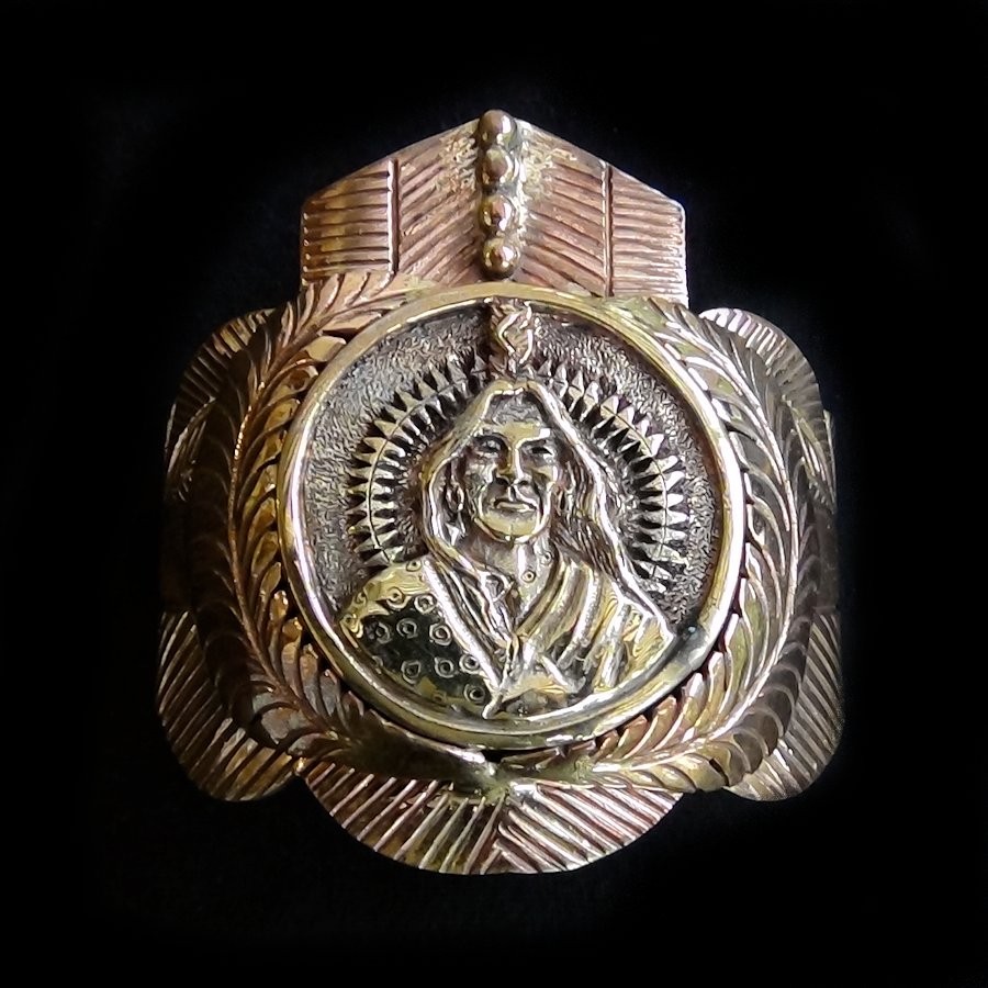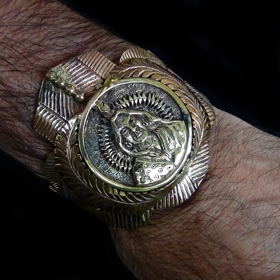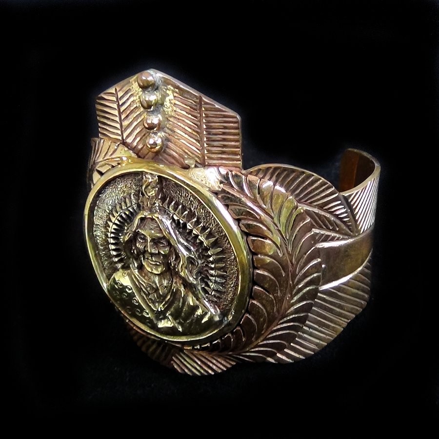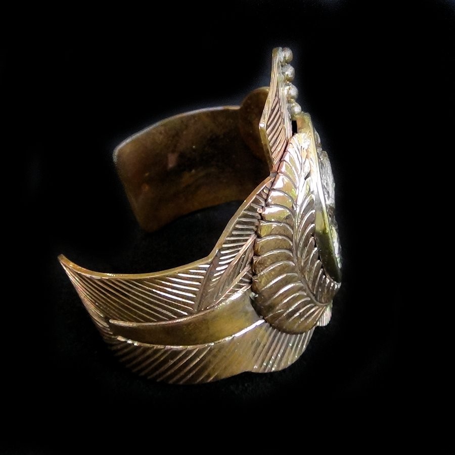 Bracelet ciselé main en cuivre orné d'une médaille en bronze.