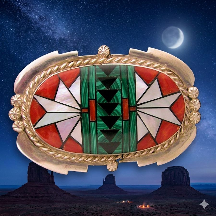 Broche en Argent Sterling/925, représentant un motif Navajo, sertie de corail, de nacre et de turquoise finement ciselée à la main.