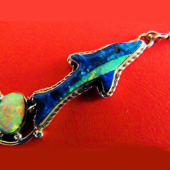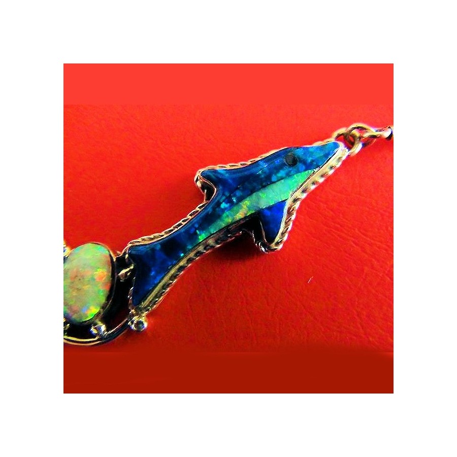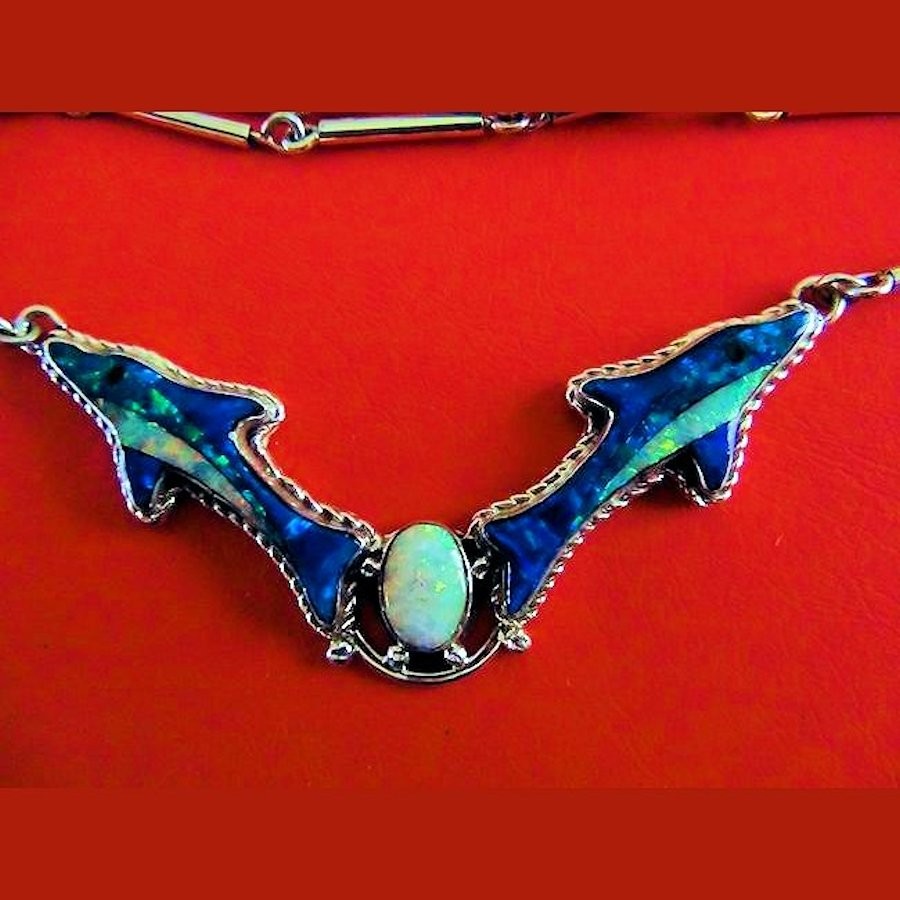 Collier en Argent Sterling/925 pour Femme, serti de lab opale représentant 2 dauphins.