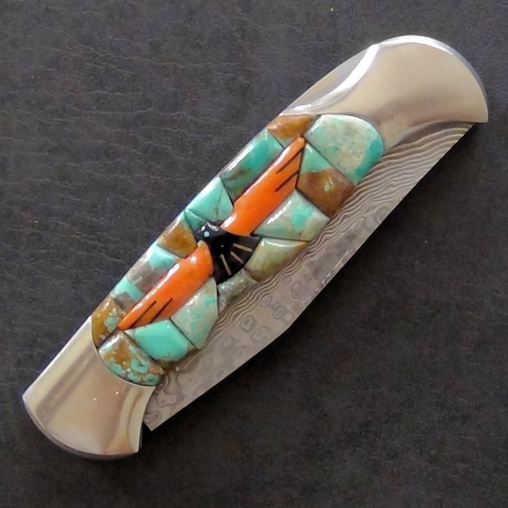 Couteau pliant dont le manche est serti de Turquoise et d'un Thunderbird.