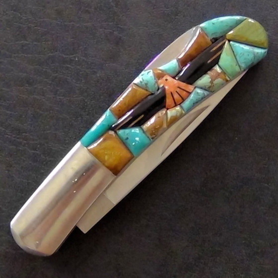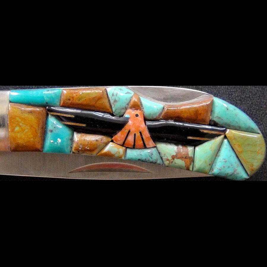 Couteau pliant dont le manche est serti de Turquoise et d'un Thunderbird.