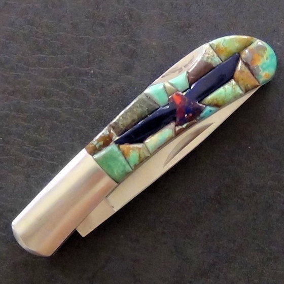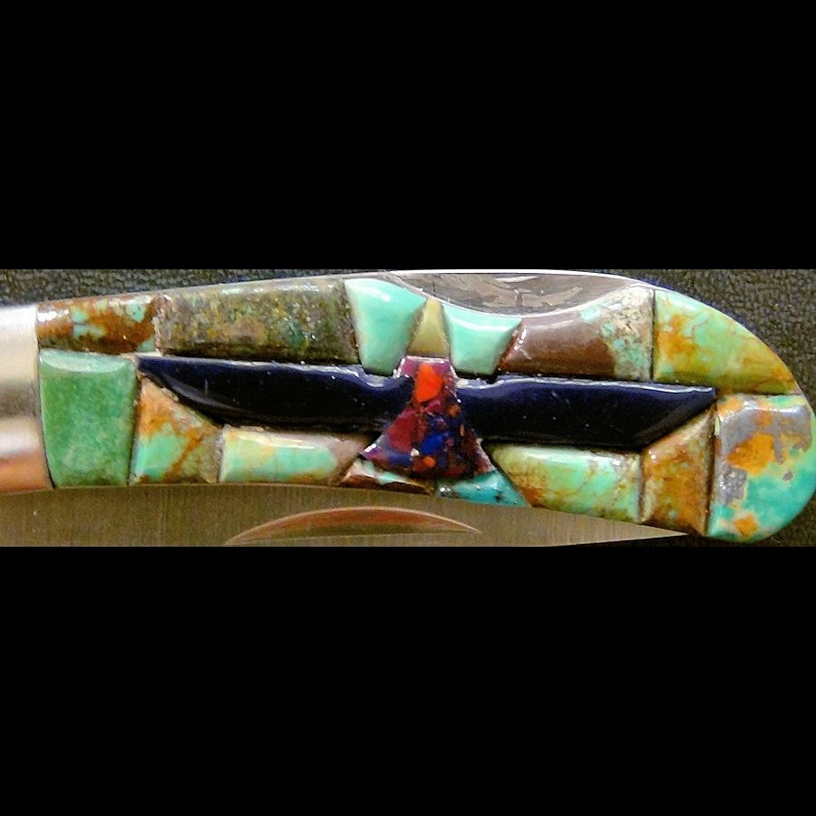 Couteau pliant dont le manche est serti de Turquoise et d'un Thunderbird.