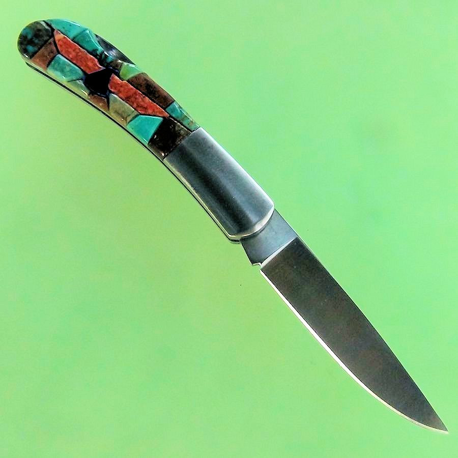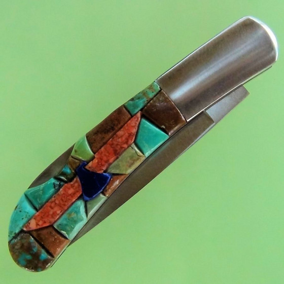 Couteau pliant dont le manche est serti de Turquoise et d'un Thunderbird.