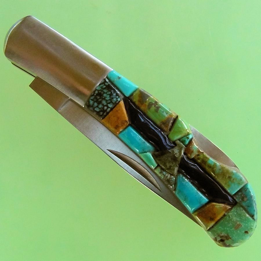 Couteau pliant dont le manche est serti de Turquoise et d'un Thunderbird.