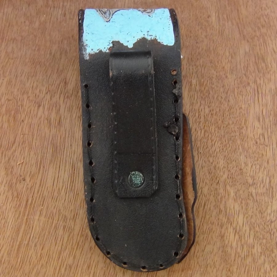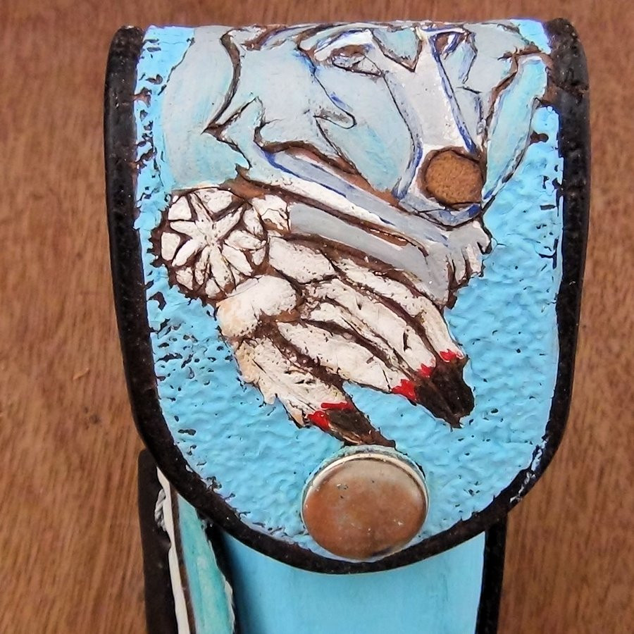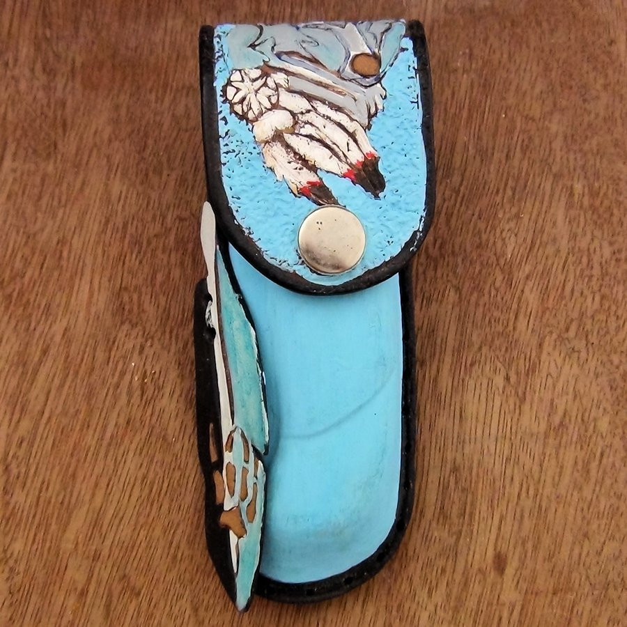 Etui en cuir repoussé et peint à la main pour couteau Modèle 1 de notre site.