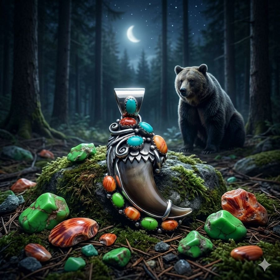 スターリングシルバー製のペンダント。アメリカ産の天然熊爪と、スリーピングビューティーターコイズ、レッドコーラル、スポンディルス、ガスペイトのカボションがあしらわれています。ペンダントはすべて手彫りです。バチカン部分には小さなターコイズが飾られています。重さ約30g。