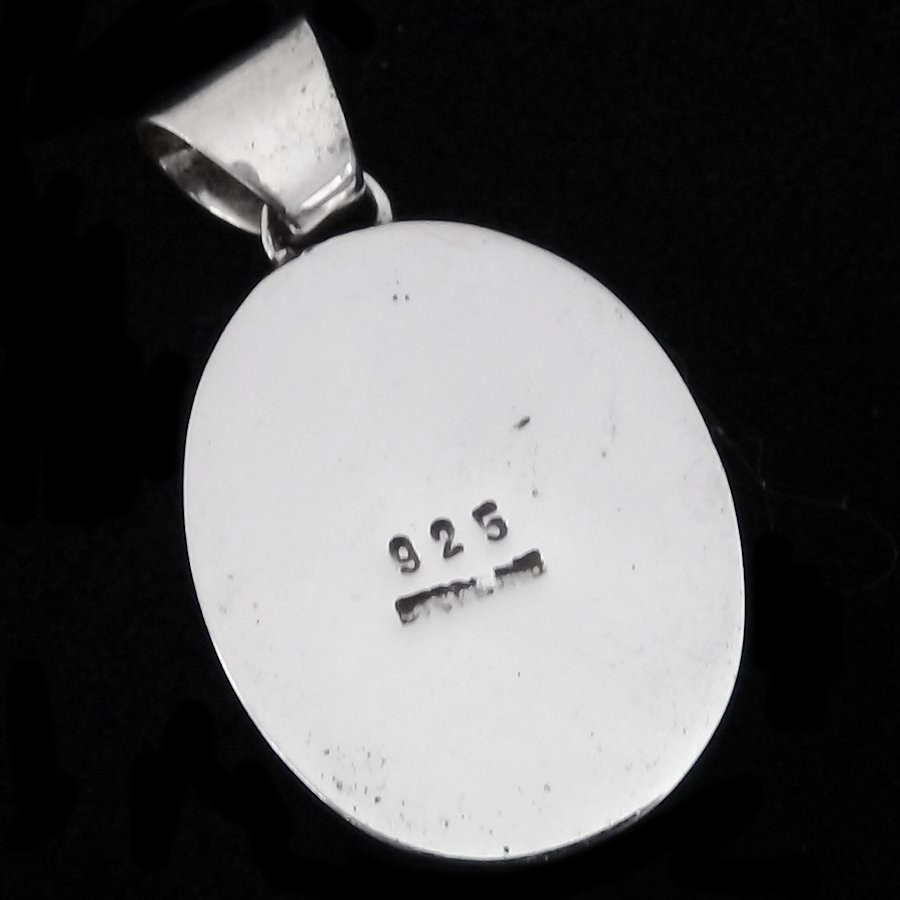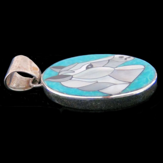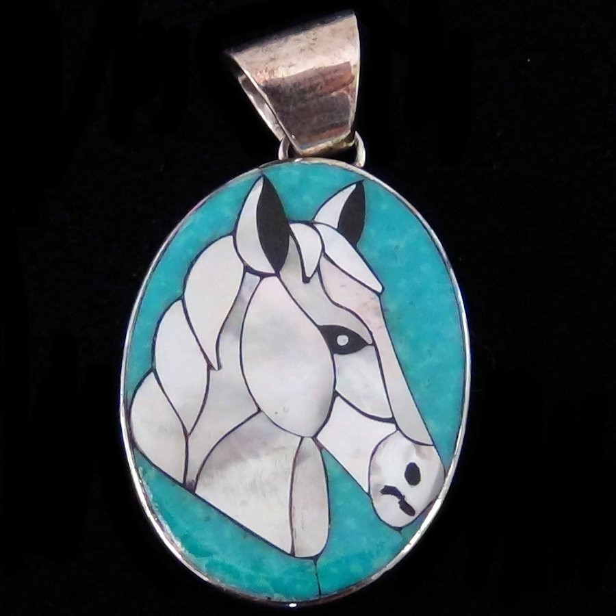 Pendentif en Argent Sterling/925, orné d'une tête de cheval en mosaïque de nacre sur fond de turquoise.