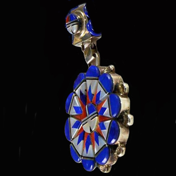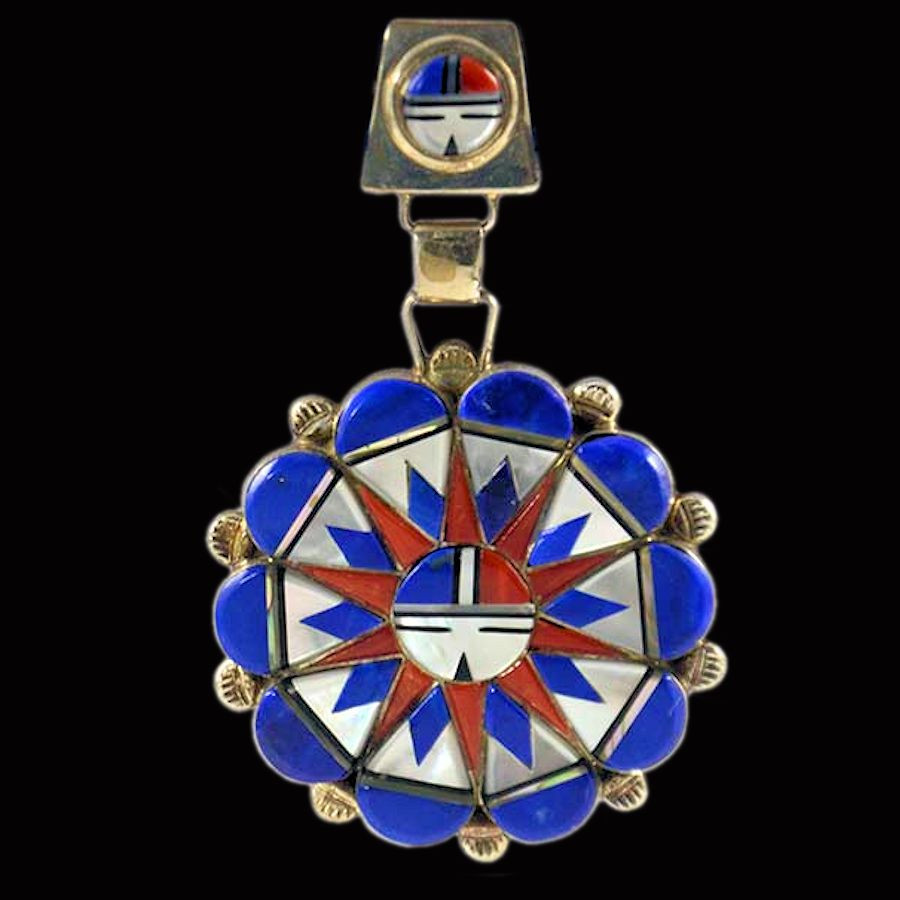 Pendentif en Argent Sterling/925 représentant le dieu soleil zuni et serti de pierres comme le corail, le lapis lazuli et la nacre.