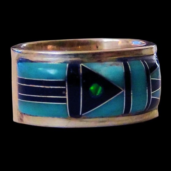 Navajo zilveren ring voor vrouw of man bezet met jeais en opaal die een pijl voorstellen, Indiaas symbool. Breedte: 1 cm.