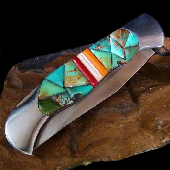 Couteau pliant dont le manche est recouvert d'une mosaïque de turquoise et d'un oiseau-tonerre.