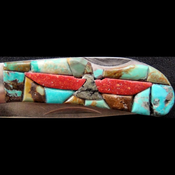 Zakmes waarvan het handvat is bezet met Turkoois en een Thunderbird.