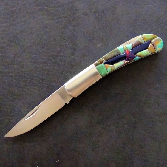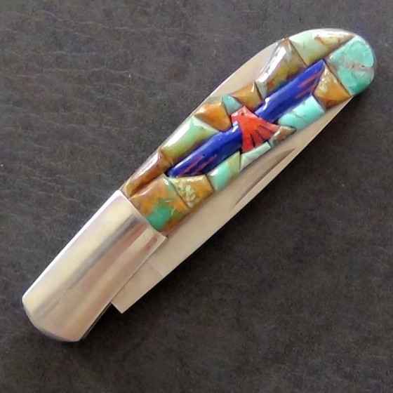 Zakmes waarvan het handvat is ingelegd met turkoois en stenen die een Thunderbird voorstellen.