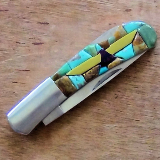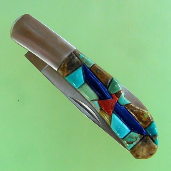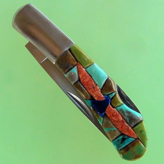 Zakmes met stalen mes en handvat versierd met turkoois gerangschikt in Overlay.