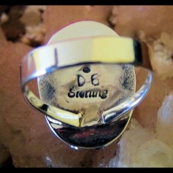 Ring in Sterling Zilver/925 voor dames en heren, volledig met de hand gebeiteld in hoefijzer en versierd met een stenen cabochon waarvan u de kleur selecteert bij het bestellen. Er is een gebeiteld paardenhoofd aan elke kant.