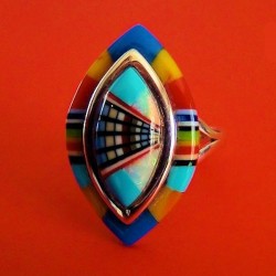 Sterling/925 zilveren ring bezet met halfedelstenen gerangschikt in een mozaïek en vertegenwoordigend een Indiaans symbool, de zonnegod.