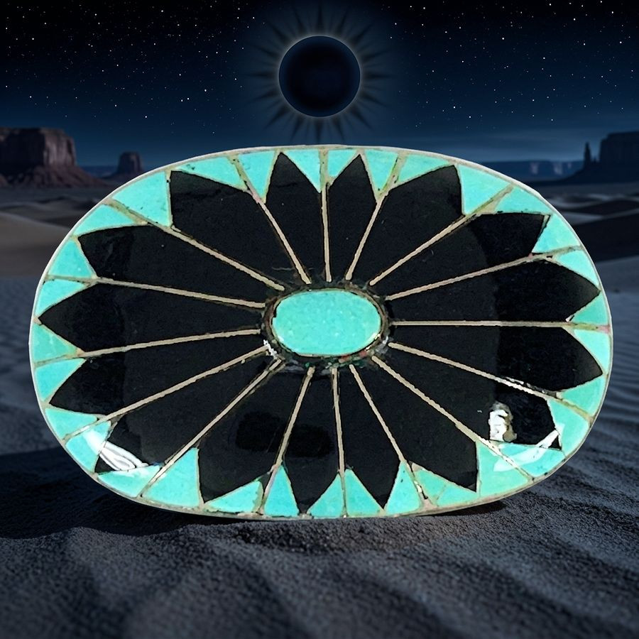 Belichaam de geest van het Amerikaanse Zuidwesten met deze prachtige Navajo-riemgesp, een waar kunstwerk. Gemaakt van 925 sterling zilver, toont dit stuk het "Zwarte Zon"-motief, zorgvuldig met de hand gesneden door inheemse Amerikaanse kunstenaars.
