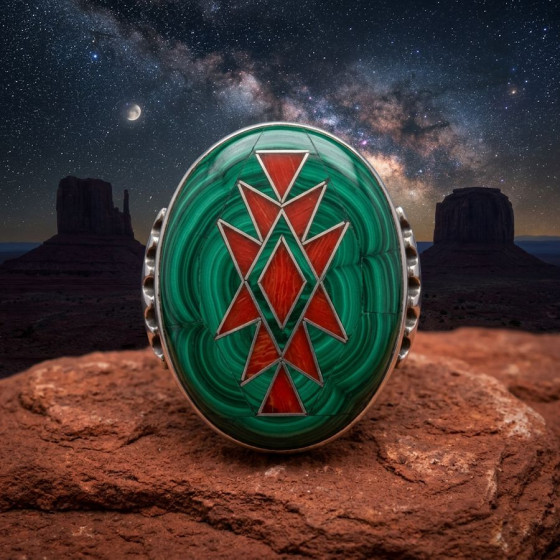 Sterling zilveren ring bezet met turkoois en versierd met een navajo symbool in koraal.