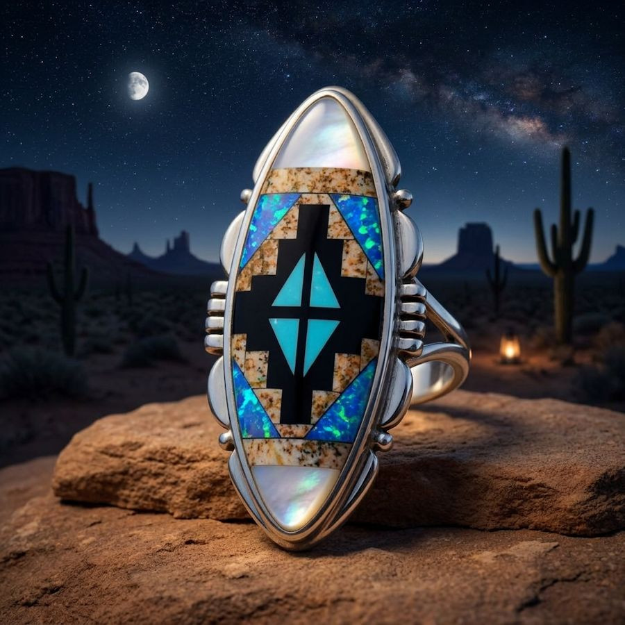 Voeg een vleugje mystiek en vakmanschap toe aan je collectie met deze prachtige ovale ring. Geïnspireerd door de rijke tradities van de Navajo-cultuur, combineert dit sieraad tijdloze elegantie met spirituele symboliek.