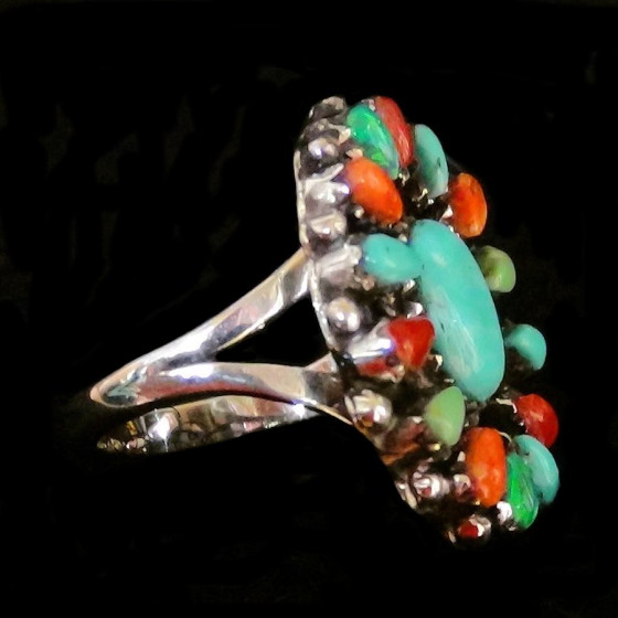 Ring gemonteerd op 925 zilver bezet met veelkleurige stenen die in tranen zijn gesneden en een bloem vormen.