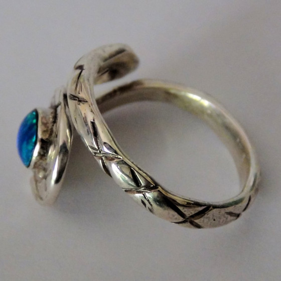 Ring in Sterling/925 zilver, versierd met een handgebeitelde slang en een halfedelsteen cabochon, waarvan u de kleur kiest bij het bestellen.
