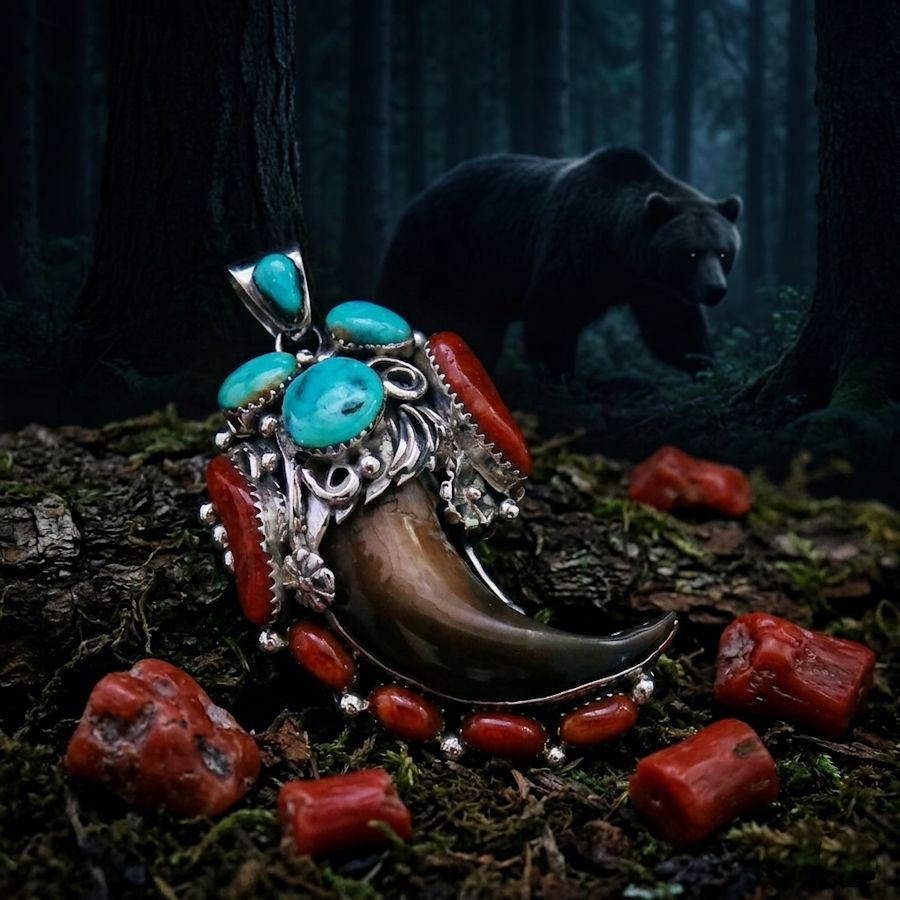 Zilveren Native American Berenklauw Hanger met Turkoois en Koraal