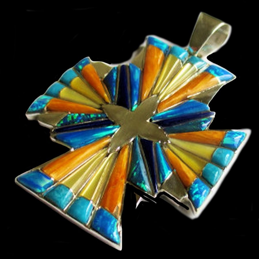 Voeg een vleugje spirituele elegantie toe aan uw collectie met deze prachtige Navajo-stijl kruishanger. Dit unieke sieraad, verkrijgbaar bij Artbju, combineert traditioneel Amérindien vakmanschap met de natuurlijke schittering van hoogwaardige edelstenen.