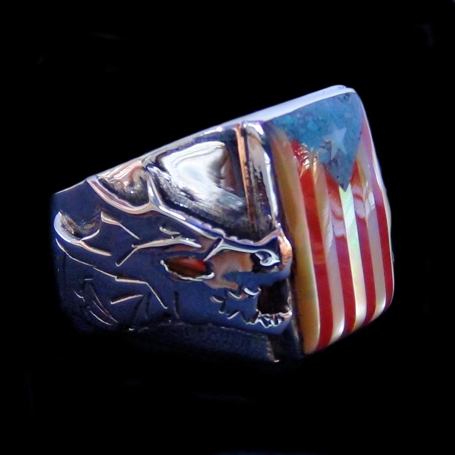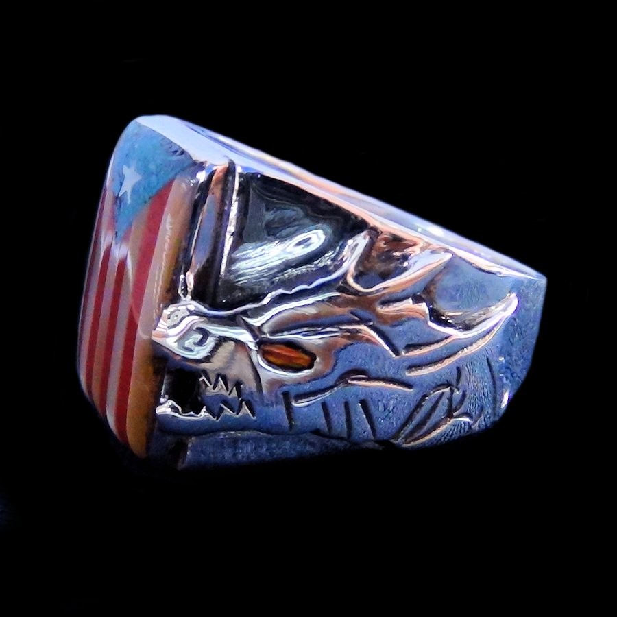 925 massief zilveren ring versierd met een met de hand gebeitelde draak aan elke kant en bezet met een Texaanse vlag, in koraal, parelmoer en turkoois.