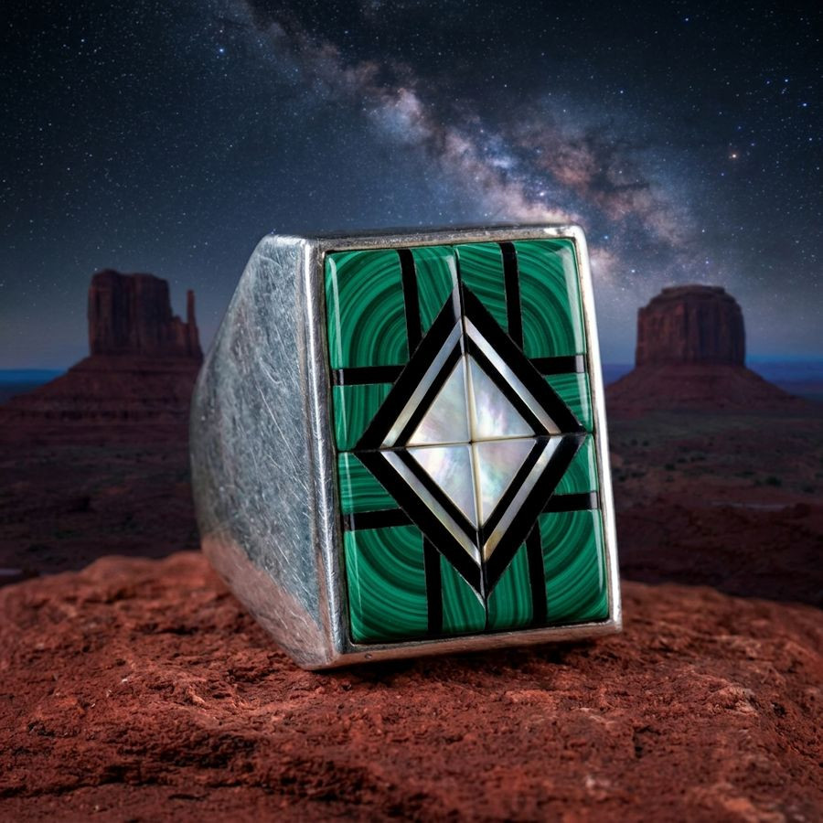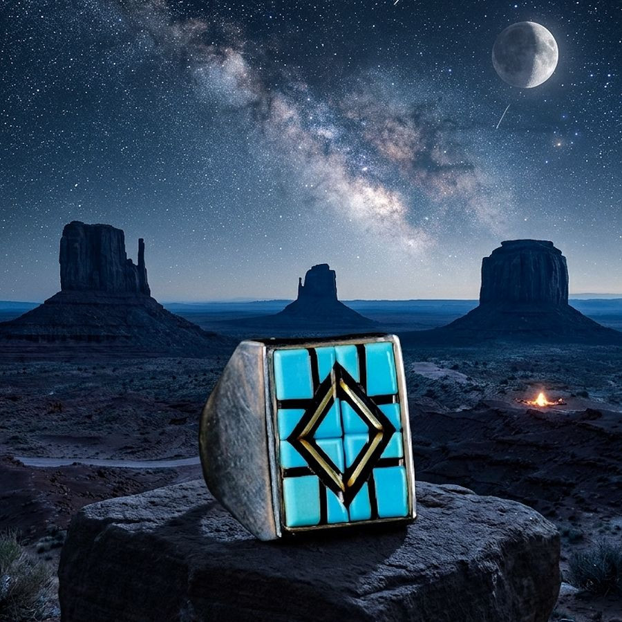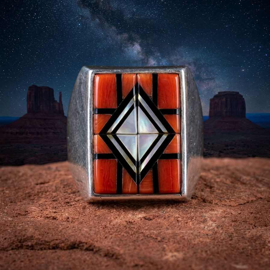 Rechthoekige Navajo-ringen met de overlay-techniek (het aanbrengen van meerdere lagen zilver) zijn iconische voorbeelden van Indiaans vakmanschap uit het zuidwesten van de Verenigde Staten. Deze sieraden zijn verkrijgbaar in verschillende stijlen en met diverse halfedelstenen: