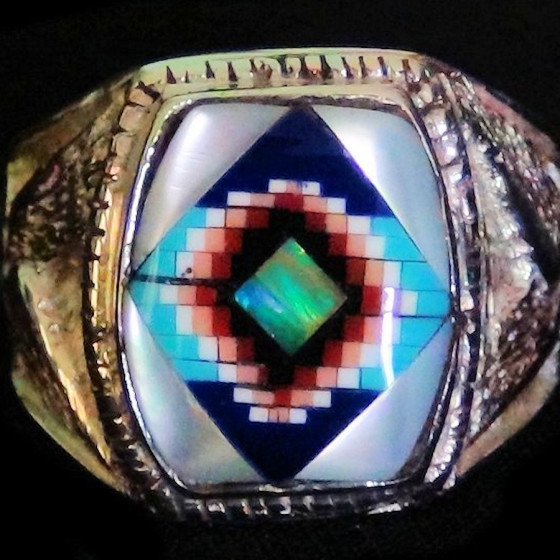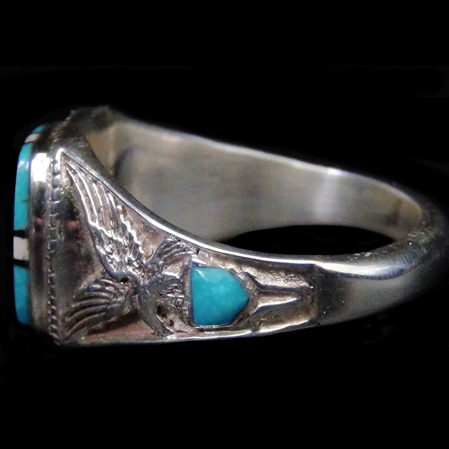 Sterling zilveren/925 ring die een Indiaas symbool voorstelt met halfedelstenen mozaïekstenen - Fijn handgesneden inleg. Aan elke zijde een adelaar in reliëf met een klein turkoois.