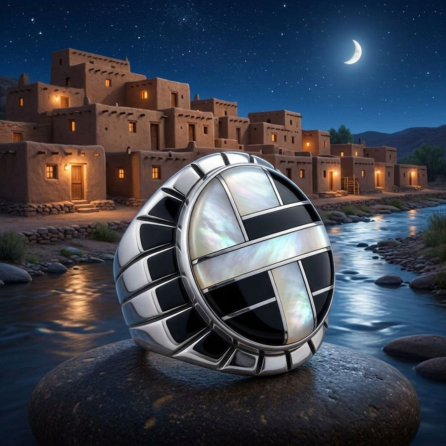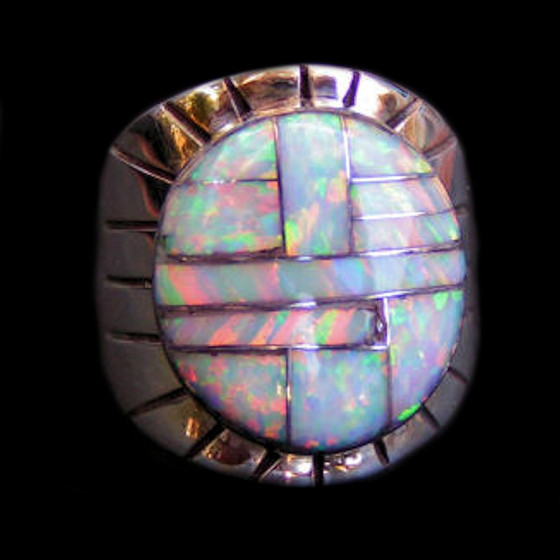 Deze ovale herenring, vervaardigd van 925 sterling zilver, heeft een steen gezet tussen smalle zilveren bandjes. Dit ontwerp staat bekend als inlegwerk in de sieraden van de inheemse bevolking van het Amerikaanse Zuidwesten.