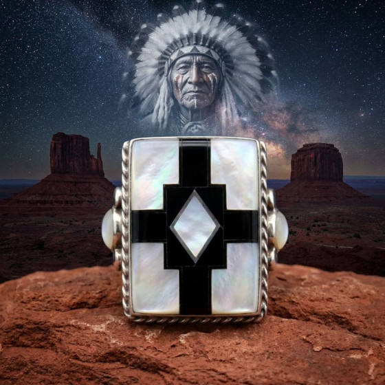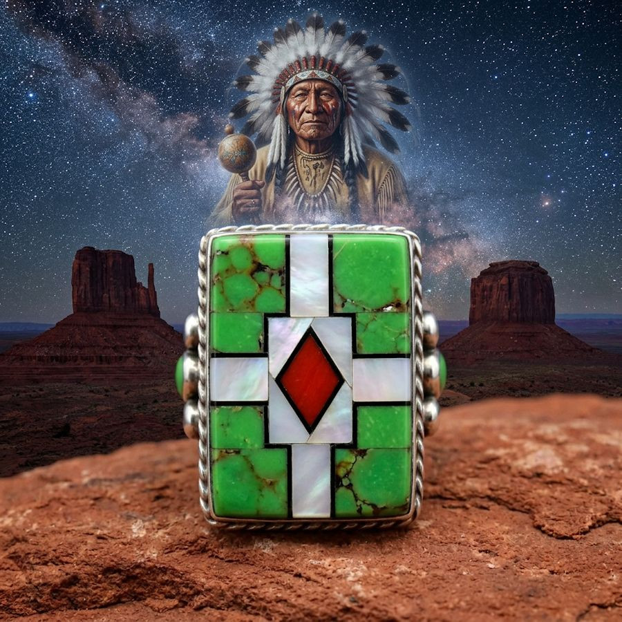 Ring in Sterling/925 zilver, bezet met parelmoer, koraal en turkoois met aan de zijkanten een dondervogel.